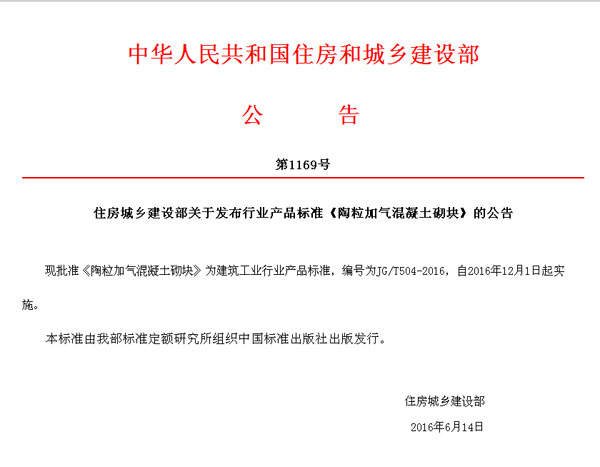 近日,住房城鄉(xiāng)建設(shè)部關(guān)于發(fā)布行業(yè)產(chǎn)品標(biāo)準(zhǔn)《陶粒加氣混凝土砌塊》的公告,現(xiàn)批準(zhǔn)《陶粒加氣混凝土砌塊》為建筑工業(yè)行業(yè)產(chǎn)品標(biāo)準(zhǔn),編號為JG/T504-2016,自2016年12月1日起實(shí)施。該標(biāo)準(zhǔn)由住房城鄉(xiāng)建設(shè)部標(biāo)準(zhǔn)定額研究所組織中國標(biāo)準(zhǔn)出版社出版發(fā)行。此次陶粒加氣塊混凝土砌塊的行業(yè)標(biāo)準(zhǔn)發(fā)行,標(biāo)志著陶粒加氣塊正式進(jìn)入規(guī)范化的市場運(yùn)作,相比加氣混凝土砌塊而言陶粒加氣塊的諸多優(yōu)點(diǎn),對國內(nèi)的建筑節(jié)能新型墻材的發(fā)展將有深遠(yuǎn)的意義和影響。