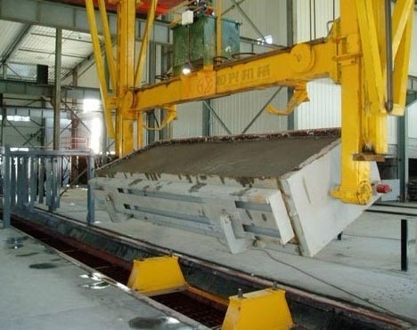 加氣磚翻轉(zhuǎn)吊具是加氣混凝土生產(chǎn)線中的主要配套設備。屬于加氣混凝土設備的重要組成部分,吊具將坯體吊放在切割臺,脫去???,坯體即能切割。 加氣砌塊自動吊具:與雙梁雙勾吊車配套,用于脫模、吊運坯體等。結(jié)構(gòu)采用液壓推進器,使四個掛鉤自動張合。 翻轉(zhuǎn)吊具把模具空中翻90度后脫模把坯體連同模具側(cè)板放置在切割小車上,進入下一步切割部分。